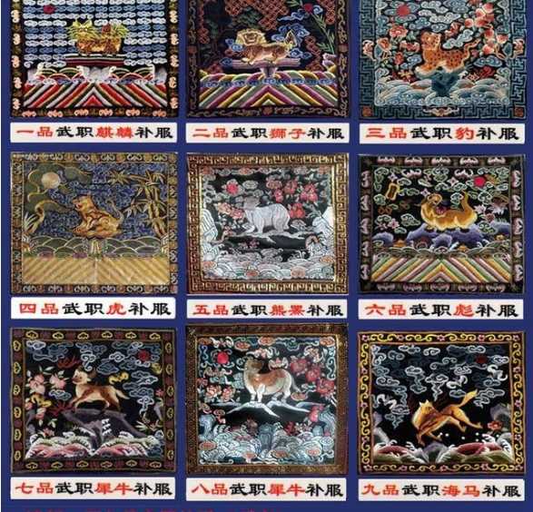 清朝(文官)五品:白鹇,它产于南方,自古以来一直被视为吉祥物。白鹇鸟展翅,象征了抛弃尘秽,迎新纳福;它还是一只忠诚的义鸟。所以,取其行止娴雅,为官不急不躁,无为而治,并且吉祥忠诚。清朝(武官)五品熊罴。据《国语·晋语》记载:“黄能入于寝门”。“黄能”即“黄熊”,比狗熊体型大而且勇猛。《诗经·小雅》“唯熊唯罴男子之样”。取其阳刚之意。清朝(文官)六品:鹭鸶,是吉祥之鸟。《魏书官氏志》:“以侍察者观,取其延颈远望”因鹭鸶飞行有序,比喻百官班。清朝(武官)六品:彪。《癸辛杂识》记述:“虎生三子,必有一彪”。可见,彪最凶猛。作为官服,是取其对敌残暴凶狠之意。清朝(文官)七品 ,鸂鶒。形大于鸳鸯,多紫色俗称紫鸳鸯。是一种彩色羽毛的水鸟,经常雌雄相随,喜欢共宿也爱同飞并游。其作为官服,象征坚定的忠心,夫妻恩爱,对国兢兢业业。清朝(武官)七八品,犀牛。《说文》解释,犀牛,一角在鼻,一角在顶。似豕,从牛,尾声。《国语·越语》“水犀之甲”犀牛的皮可以做铠甲。犀牛可做武官的官服的,是取其皮可制甲,角可制矛兵器犀利之意。清朝(文官)八品: 鹌鹑,在古代鹌和鹑本是两种鸟,《山海经》《本草纲目》记载,鹌与鹑两物也,形状相似,但无斑者为鹑也。后经语言演化将二者合称为一物。官服鹌鹑,安是谐音,是安全,事事平安安居乐业意思。(文官)九品,练雀,又称练鹊,绶带鸟。绶带是古代帝王百官礼服的配饰,而练雀的尾羽与之相似,故名,“绶带鸟”。作为基层官员补服,《韵会》云:“谓之性喜”。喻绶带鸟能报喜。清朝(武官)九品,海马。此海马非彼海马,并不是指大海里面的海马,而是神话中的神兽能在天空飞翔,也能在海中穿行。官服寓意,古代对下级军官的要求非常高,就能指挥步兵陆战又可指挥海军水战,所以军队的战斗力极强。江山就一定会稳固。