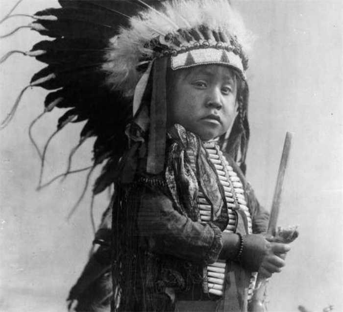1907年,一个印第安儿童,头戴着传统的鹰羽冠,手里拿着的,貌似是一把玩具枪。