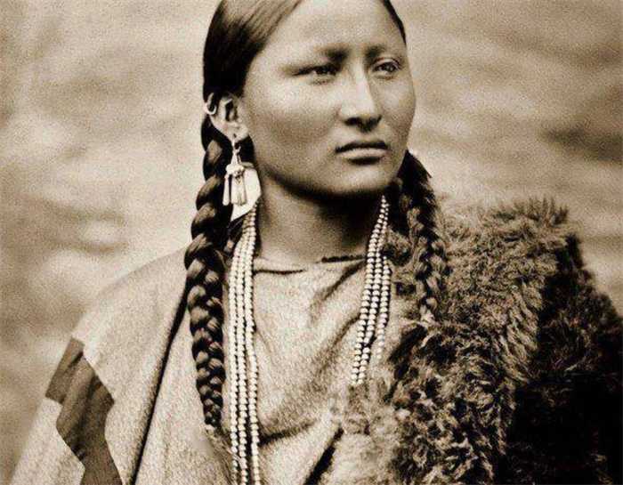1878年,美国蒙大拿州基奥堡,一个夏安族女子。她的鼻子尖挺,模样标志。脖子上挂着长长的项链,耳朵上戴的耳环貌似很是沉重。