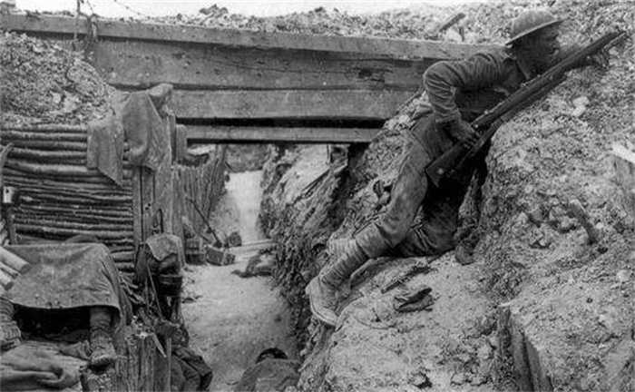 法国北部的英国/澳新军团战壕:肮脏的战壕里,零散躺着几具士兵的尸体。唯一幸存的战士,浑身被泥巴覆盖,就像从泥堆里爬出来一样。他正抓着步枪,斜趴在战壕的斜坡上,目不转睛地盯着前方地面的动静。似乎敌军已经迫在眉睫。从他专注而坚毅的神情中,我们甚至能够感受到他内心深处的紧张气息,以及战斗到底的决心和勇气。