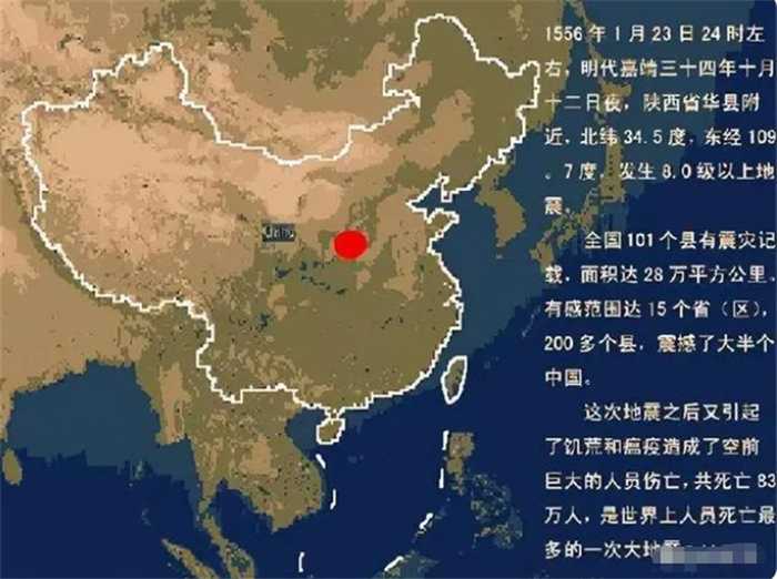 这场地震发生于明朝嘉靖壬寅年间,也就是公元1556年的陕西省南部,此次地震使得陕西、山西、河南三省的100多个县遭到巨大破坏,大半个中国都能感应到这场地震,留下来的史料记载,这场地震引发的死亡人数高达83万人。