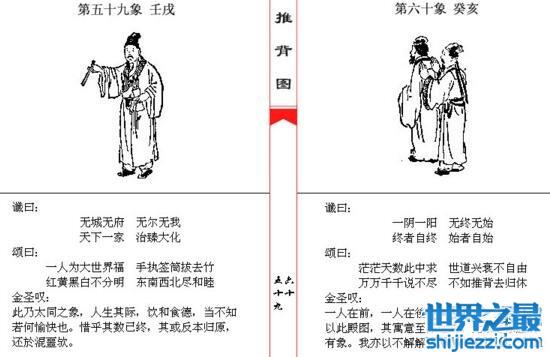 直到袁天罡推他的背,说道:“天机不可再泄,还是回去休息吧”,因此这本预言奇书得名《推背图》。《推背图》共有六十幅图像,每一幅图像下面附有谶语和“颂曰”律诗一首,预言了从唐开始一直到未来世界大同发生在中国历史上的主要事件。
