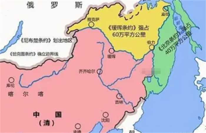 沙俄强迫黑龙江将军奕山在黑龙江签署了《瑷珲条约》,割让了黑龙江以北60万平方公里的领土,并将乌苏里江以东的土地列为两国共管。1860年,沙俄又逼迫清政府签署了《北京条约》,导致外东北这个拥有100万平方公里神圣疆土的地方成为了俄罗斯的领土。