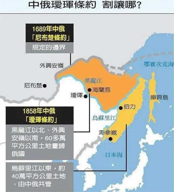 条约规定“大兴安岭以南,黑龙江以北归约60万平方公里的土地归俄国,乌苏里江以东的40万平方公里土地划为两国共管疆土。”后来,俄国同清政府签订《北京条约》,清政府承认这100万平方公里的土地割让给俄国。