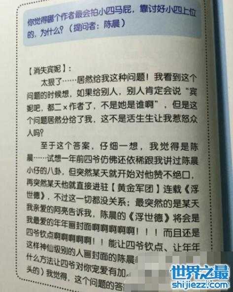 还有在李枫的微博下有人评论了一句:“叶阐和陈晨还有你长得比较好看,然后他们后来势头很好,而你几近消失。”更是让人感到细思极恐!之后网友又找到了早年几位作者被采访的对话,基本上可以认定叶阐和陈晨都在被郭敬明骚扰男作家的名单之中了。