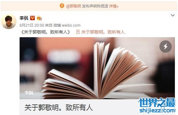8月21日,作家李枫在微博上发布长文爆料称,郭敬明经常对自己公司的男作家进行性骚扰和性侵犯等。于是瞬间郭敬明骚扰男作家一事成为了无数人的关注的,而后郭敬明微博上否认道“1.完全捏造。2.已让律师处理。 ”