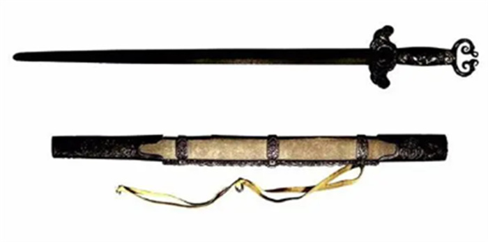乾隆“贯霄”剑是乾隆皇帝御制的宝剑之一,保存在故宫博物院。这把剑的设计精巧,剑长96厘米,刃长77厘米,刃宽2.9厘米,刃厚0.9厘米。剑身浮雕鎏金,刻有蕉叶纹和宝相花纹,剑柄以木质为主,缠有黄丝绳,剑格为元宝形状。剑的外观精美独特,与众不同。