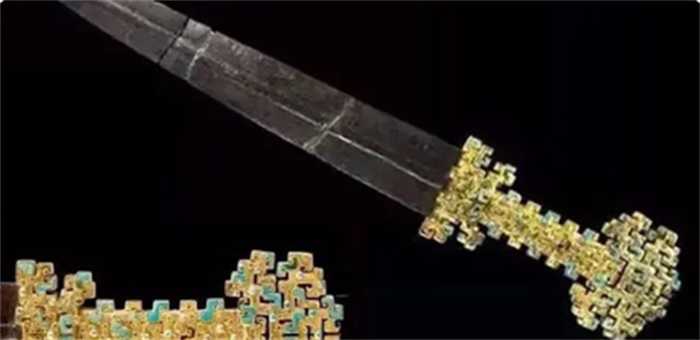 这把剑是最早被发现的黄金剑之一,制造于春秋晚期,于1992年出土于陕西省宝鸡市益门村2号墓,现存于兵马俑博物馆。剑身采用铁制,剑柄则采用纯金打造。剑柄部分设计别致,装饰有蟠螭纹,同时还嵌有绿松石。历史上,仅有少数剑的剑柄采用纯金装饰,并嵌有绿松石,而如今只有这一把。