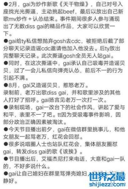 总之微博朋友圈等等,都是两者互相撕逼对骂,真的是给人一种贵圈真乱的感觉啊。而引起这场集体diss的原因不得而知,只知道GAI签约刘洲公司后,而刘州是《中国有嘻哈》音乐总监,确实容易让人联想到黑幕,在加上最后出现了双冠军,真的让人们觉得非常无语啊。