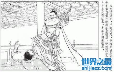 如此没有人道,人生谢幕的一幕也是非常经典:朱温被杀死时,时年六十一岁。临死前,他肯定没有料到,自己一生杀人无数,想不到最后却被自己的儿子所杀,一生贪淫好色,最终却因女人结束了一生。更令人叹惋的是,他真心地爱他的妻子张惠,却没有遵从妻子临终前的“戒杀远色”四字遗言,以致最后身败名裂。