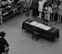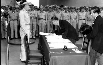 1945年9月2日上午9时,标志着二战结束的日本投降签字仪式,在停泊在东京湾的密苏里号主甲板上举行。代表日本天皇和政府的日本新任外相重光葵和代表日本帝国大本营的陆军参谋长梅津美治郎依次在投降书上签字 ;