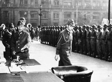 递交投降书:1945年9月9日9时,南京中央陆军军官学校大礼堂举行第二次世界大战中国战区受降仪式,代表日本侵华日军总司令冈村宁次正式向代表中华民国政府陆军总司令何应钦呈交投降书 。