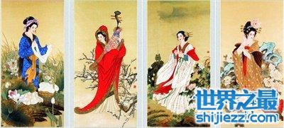 中国古代四大美女,即西施、王昭君、貂蝉、杨玉环 。四大美女享有“沉鱼落雁之容,闭月羞花之貌”的美誉。“沉鱼、落雁、闭月、羞花”是由精彩故事组成的历史典故。“沉鱼”,讲的是西施浣纱的故事。“落雁”,指的就是昭君出塞的故事,“闭月”,是述说貂蝉拜月的故事,“羞花”,谈的是杨玉环贵妃醉酒观花时的故事。