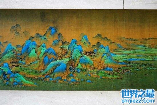 千里江山图,北京故宫博物院馆藏珍品。绢本,设色,纵51.5厘米,横1191.5厘米, 为中国北宋青绿山水画作品。作者王希孟。王希孟18岁为北宋画院学生,后召入禁中文书库,曾得到宋徽宗赵佶的亲自传授,半年后即创作了《千里江山图》。
