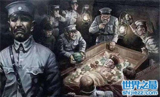 原来地下宫殿里有深水,那些稀有的珍宝和骨头都浸在泥里。匪徒打开地下宫殿后,就开始在这些水泥里面打捞宝物,因为当时陵墓里面光线不是太好被大捞上来的东西没有经过仔细辨认就递给了上层的士兵,但这些并不是什么宝物大都是已经泡的发霉的骨头,所以士兵很愤怒把骨头到处乱丢到处发疯般的寻找宝物,乾隆的尸骨也被破坏,没想到身前这么风光的十全老人会落得这个下场。