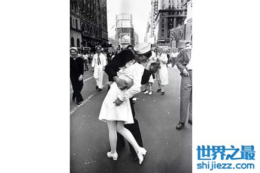 就在当时一位美国海军士兵走到了纽约的时代广场上搂主以为素未谋面的女护士亲吻了下去。而就在这一瞬间,被当时纽约《生活》杂志社的摄影师阿尔弗雷德·艾森施泰特给抓拍了下来。而这张照片便成为了具有历史重大意义的画面。自那以后,每年的8月14日都会有数百位的那女在时代广场上再度重现“胜利之吻”的场景,以此来纪念二战结束。