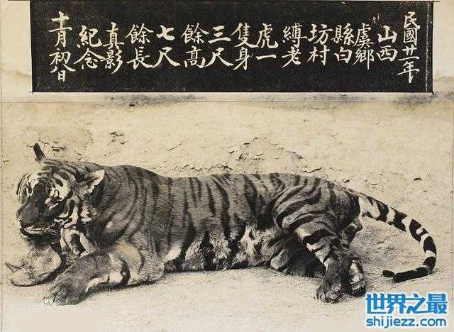 民国21年捕获的华北虎(感觉被捕猎者打的很惨,没有王少堂评书中说的“虎死不倒架”的气势)