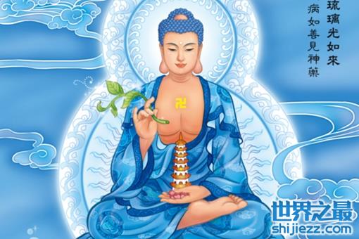 药师佛,又作药师如来、药师琉璃光王如来、南无琉璃世界光王如来、大医王佛、医王善逝、十二愿王。为东方净琉璃世界之教主。据《药师琉璃光如来本愿功德经》载,日光遍照菩萨与月光遍照菩萨同为药师佛的二大胁士。日光菩萨与月光菩萨同为无量无数菩萨众之上首,依次递补佛位,悉能持药师如来之正法宝藏。药师佛面相慈善,仪态庄严,身呈蓝色,乌发肉髻,双耳垂肩,身穿佛衣,坦胸露右臂,右手膝前执尊胜诃子果枝,左手脐前捧佛钵,双足跏趺于莲花宝座中央。身后有光环、祥云、远山等景象。