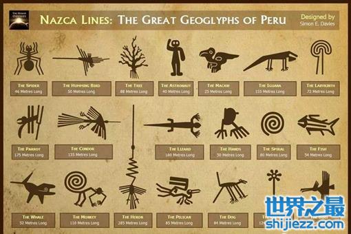 此外,还有一些巨大的图案在地面上,如:猴子、蜘蛛、蜂鸟等。令人们费解的是,为什么要绘制如此庞大比例的图形,这些图形只有从空中才能进行观看。它们有什么重大意义呢?一些人认为它们与天文学有关,还有人将这些图案与宗教仪式联系在一起。目前,最新的观点认为这些图案指示着宝贵的水源。但事实上,以上的观点都没有确切的依据,迄今没有人真正揭晓其中的谜团。