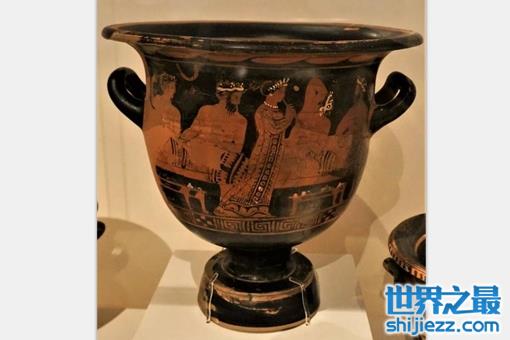 这件制作于公元前五世纪末四世纪初的双耳喷口罐上描绘了一位吹笛子的女子在宴会上为众人表演的场景。