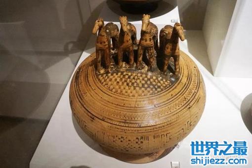 这件绘满了几何图案的陶器制作于公元前750-735年,盖上塑造了四匹造型可爱的小马。