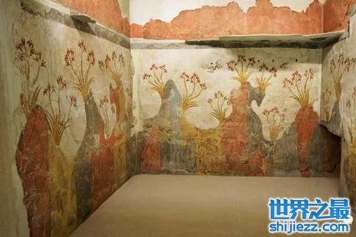 在第一个房间的壁画中,左边是两个少年拳击手,看上去也就七八岁的样子,梳着长长的辫子,手上戴着拳击手套,腰间系着遮羞布,从姿势看感觉更像是某个仪式中的表演。右边是两只羚羊,那简洁流畅的线条一下就刻画出了羚羊苗条敏捷的身姿,就绘画技巧而言堪称完美。你看古希腊的绘画就比古埃及进步多了。