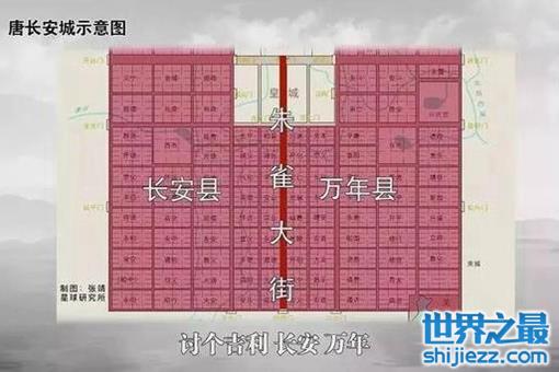 隋唐长安城面积约87平方公里,城市缔造者宇文恺在城市规划之初,就把城市按照周易学说以及龙首原地形,严格设计。隋初全城被东西、南北交错的二十五条大街分为110个坊(唐朝108坊),沿朱雀大街分列排布。东部万年县,西部长安县。
