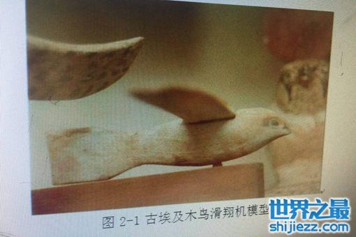 早在1898年,有人在埃及一座4000度年前的古墓里发现了一个与现代飞机极为相似的模型。这个模型是当时古埃及盛产的小无花果树木制成的,有31.5克重。因当时人们还没有飞机这个概念,便把它称为“木鸟模型”。这个模型现在放在开罗古物博物馆第22室,编号为“物种登记”第六千三百四十七号。