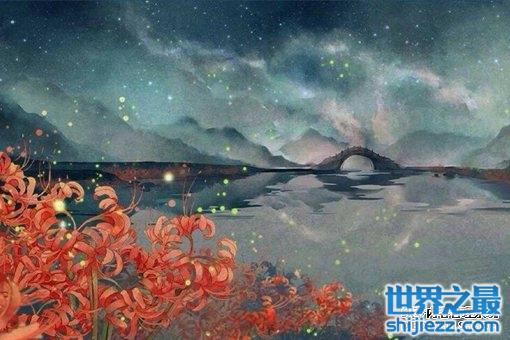 相传过了鬼门关便上一条路叫黄泉路,路上盛开着只见花,不见叶的彼岸花。花叶生生两不见,相念相惜永相失,路尽头有一条河叫忘川河,河上有一座桥叫奈何桥。走过奈何桥有一个土台叫望乡台。望乡台边有个亭子叫孟婆亭,有个叫孟婆的女人守候在那里,给每个经过的路人递上一碗孟婆汤。忘川河边有一块石头叫三生石。喝下孟婆汤让人忘了一切。三生石记载着前世今生来世。走过奈何桥,在望乡台上看最后一眼人间。