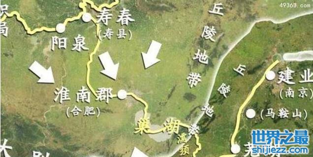 第三条是从丹阳郡芜湖县(今安徽省芜湖市)沿濡须水和巢湖进攻合肥,再从合肥沿肥水攻入淮河流域,最后沿淮河支流颖水攻许昌。当时芜湖和濡须水都在孙权控制之下,只要攻占合肥就能进逼淮河。