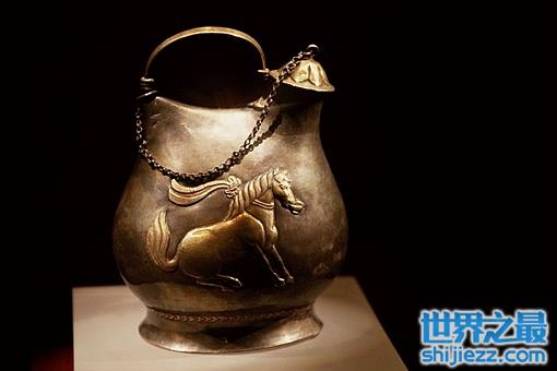 藏于陕西省历史博物馆,高18.5厘米,扁圆腹,莲瓣纹壶盖,弓形提梁,一条细链连结着壶盖与提梁。壶底与圈足相接处有“同心结”图案一周,系模仿皮囊上的皮条结。