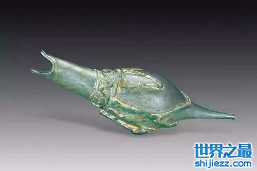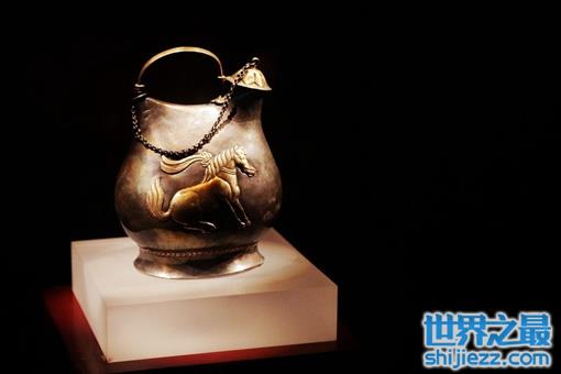 唐代,1970年西安南郊何家村出土。又称镶金兽首玛瑙杯,通高6.5厘米,长15.6厘米,口径5.9厘米。这件国之重宝,象征着财富和权力,是一件高贵的艺术品,同时它也很可能是中西亚 某国进奉唐朝的国礼,意义非同一般,是在东西方文明碰撞的火花中诞生的一件重要文物。
