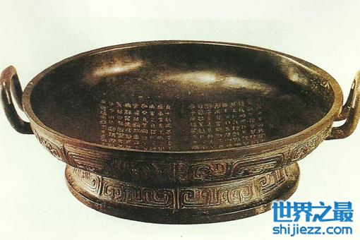 属西周康王时期,清道光间在陕西眉县礼村出土。大盂鼎是现存西周青铜器中的大型器,造型端庄稳 重、浑厚雄伟、典丽堂皇,为世间瑰宝。西周早期的金文有瑰异凝重、雄奇恣放、质朴平实等数类,大盂鼎属于瑰异凝重这一类,铭文大字,字体庄严凝重而美观, 故在成、康时代金文中,以书法的成就而言,当以其居首位。