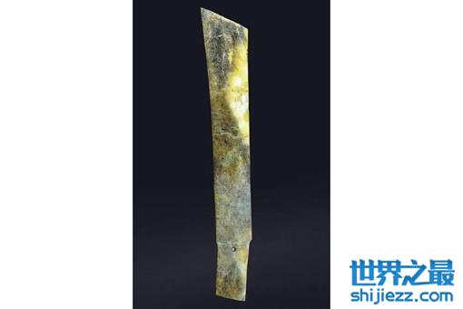 属商代前期,1974年黄陂盘龙城李家嘴三号墓出土。玉质仪仗器,长94厘米、宽14厘米、厚仅1厘米,堪称“玉戈之王”。