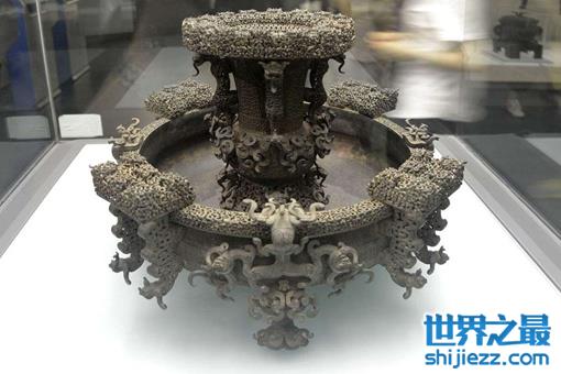 属春秋中期,1978年河南淅川下寺出土。通高28.8厘米、器身长103厘米、宽46厘米。禁为承置酒器的案,其器身以粗细不同的铜梗支 撑多层镂空云纹,十二只龙形异兽攀缘于禁的四周,另十二只蹲于禁下为足。这是我国迄今发现用失蜡法铸造的时代最早的铜器,其工艺精湛复杂,令人叹为观止。
