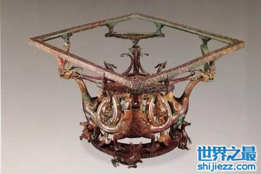 属战国时期,1974年河北平山县出土。通高36.2厘米,上框边长47.5厘米,环座径31.8厘米,重18.65公斤。此案周 身饰错金银花纹,下部有两牡两牝四只侧卧的梅花鹿环列,四肢蜷曲,驮一圆环形底座。中间部分于环座的弧面上,立有四条神龙,分向四方。四龙独首双尾。龙身 蟠环纠结之间四面各有一凤,引颈长鸣,展翅欲飞。上部龙顶斗拱承一方形案框,斗拱和案框饰勾连云纹。这件方案案面原为漆板,已腐朽不存,仅留铜案座。它的 造型内收而外敞,动静结合,疏密得当,一幅龙飞凤舞图跃然眼前,突破了商、周以来青铜器动物造型以浮雕或圆雕为主的传统手法。另外,四条龙头上各有一个斗 拱,第一次以实物面貌生动再现出战国时期的斗拱造型。