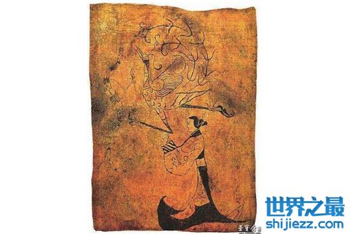 西汉,1972年湖南长沙马王堆一号墓出土。帛画覆盖在一号墓即辛追墓的内棺上,呈T字形,长205厘米,上部宽92厘米,下部宽 47.7厘米,制作精美、色彩鲜艳,画面上中下三部分分别表现了天上、人间与地下的场景,体现了西汉初年的神仙方术思想,学者认为帛画的作用是接引死者走 向天国。华盖以上为天上部分,所绘以神、龙、日、月为主。正上方的神,人首蛇身、披发而坐,其蛇尾缠绕在他身下。神话中女祸、伏羲、烛龙都是这种形象,但 传说中由烛龙镇守天门,这与天国部分正下方的两扇开启的大门相对应,所以他极可能是烛龙神。烛龙的左右身侧画着五只仰天长啸的仙鹤,这是代表长寿的瑞鸟, 它们使天国呈现一片祥瑞的气氛。烛龙的右边有九个红色的太阳,里面蹲伏着一只黑色的类似于乌鸦的鸟,古人称之为金乌,是古人眼中太阳的精灵。