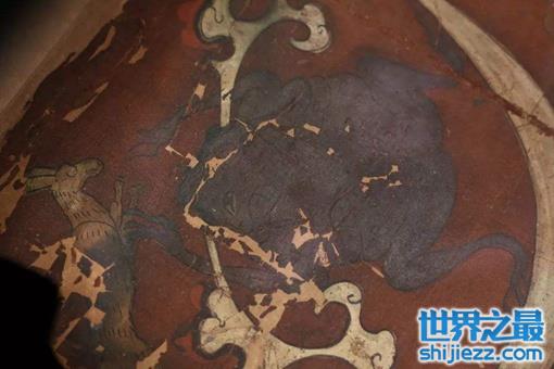 这些太阳半隐 半藏在弯曲绵长的蓝色扶桑树中,而这种传说中的神树是太阳的栖息地,它生长在东海,有几千丈高。烛龙的左边则是月宫的描绘,银白色的月牙弯弯如钩,正是月 初的月象。其上有一只体形硕大的蟾蜍蹲伏着,口中还含着一颗可除百病的仙草灵芝。再上面是一只昂首腾跃的玉兔,它轻盈瘦长的身躯与蟾蜍形成了有趣的对比。 月亮之下,是一个美丽的女子轻舒广袖翩然而舞。烛龙之下,有两只展翅相对的飞鸟,长颈短尾,这应是楚歌中鸿鹄高飞举千里的鸿雁。其下,有两只兽首人身的怪 物骑在神马飞黄上,手中牵绳,向左右飞奔,绳上扯着一个呈梯形的乐器——铎,振铎作响是欢迎升天之人的最高仪式。铎之下是两个呈倒形的天门,门上两旁是神 豹两只和紧守通天大道的两位守门神—司阍,现在此二神躬手相立,恭敬作揖,他们和天国中所有的神、龙、瑞兽一起,正满怀欣喜地恭迎升天的老夫人。人间部分 以华盖作屋顶,上有朱雀鸟作为装饰。华盖下是神禽飞廉,这只貌似猫头鹰的怪鸟专司引魂升天。