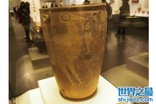 属新石器时代仰韶文化类型,1978年出土于河南省临汝县阎村。陶质彩绘,器高47厘米、口径32.7厘米。陶缸绘有鹳鸟衔鱼,旁边竖立一件石斧的画面,作者用白色在夹砂红陶的缸外壁绘出鹳、鱼、石斧,以粗重结实的黑线勾出鹳的眼睛、鱼身和石斧的结构,画面效果粗犷有力,绘画具有中华 民族远古时代的造型特征,是一件罕见的绘画珍品。