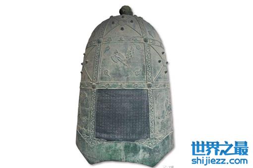 唐代,陕西省西安景云观遗物。陕西省博物馆里陈列着一座雕铸着飞天、龙、狮、独角兽、蔓草和云朵的大铜钟——极为珍贵的唐“景云钟”。它是唐景 云二年(公元711年)铸造的,高247厘米,口径165厘米,距今已有1300年,但敲起来,声音仍清脆宏亮,音韵优雅浑厚,听了使人心旷神怡。现在人 们在除夕之夜听到的中央人民广播电台播放的“新年钟声”,就是景云钟的录音。