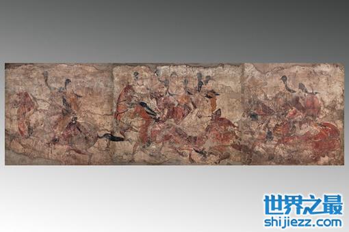 属北齐时期,1979年山西太原娄睿墓出土。《鞍马出行图》位于墓道西壁中栏、作长卷式展开。