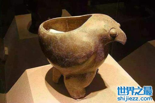属新石器时代,1957年出土于陕西省华县太平庄。通高只有36厘米,但看上去显得威武而雄壮。鹰的前胸为鼎腹,饱满粗壮,器口开在鹰的背部。鹰 的双目圆睁,周身光洁未加纹饰,喙部呈有力的勾状。