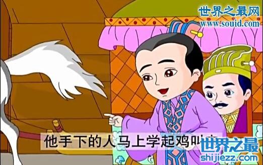 原来,孟尝君的另一个门客会学鸡叫,而鸡是只要听到第一声啼叫就立刻会跟着叫起来的。怎么还没睡蹭实鸡就叫了呢?守关的士兵虽然觉得奇怪,但也只得起来打开关门,放他们出去。天亮了,秦昭王得知孟尝君一行已经逃走,立刻派出人马追赶。追到函谷关,人家已经出关多时了。孟尝君靠着鸡鸣狗盗之士逃回了齐国。故事出自《史记·孟尝君列传》。成语“鸡呜狗盗”比喻卑下的技能或具有这种技能的人。