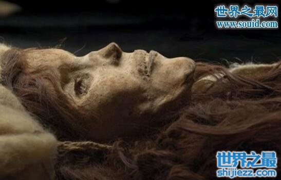 外露的面容可以看出死者年龄比较年轻,脸庞姣小,鼻子高高,大大的双眼,长长的眼睫毛,历历可数,浓密的金发,略呈卷曲,散垂在肩后。