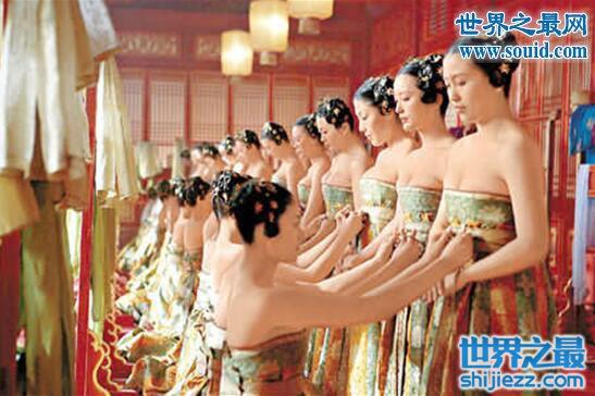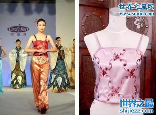 唐朝以前的内衣肩部都缀有带子,到了唐代,出现了一种无带的内衣,称为“诃子”。这也是其外衣的形制特点所决定的:唐代的女子喜穿“半露胸式裙装”,她们将裙子高束在胸际然后在胸下部系一阔带,两肩。上胸及后背袒露,外披透明罗纱,古代内衣若隐若现。