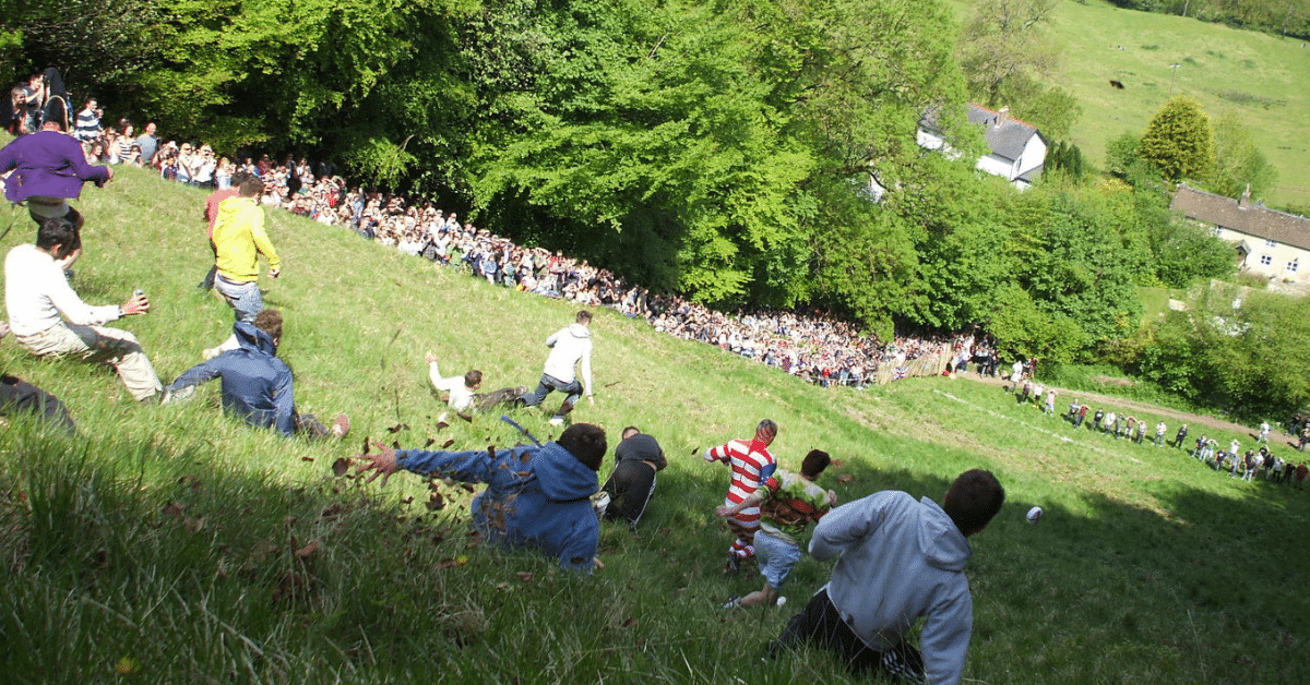 英国格洛斯特区在五月的最后一个星期一庆祝滚动奶酪节,他们从山顶向下滚动奶酪。这似乎是一项简单的任务,但事实并非如此,奶酪的速度可达100公里/小时,这真是不可思议。事实上,比赛中跌倒受伤的情况屡见不鲜,总会有医疗队随时准备好照顾伤者。