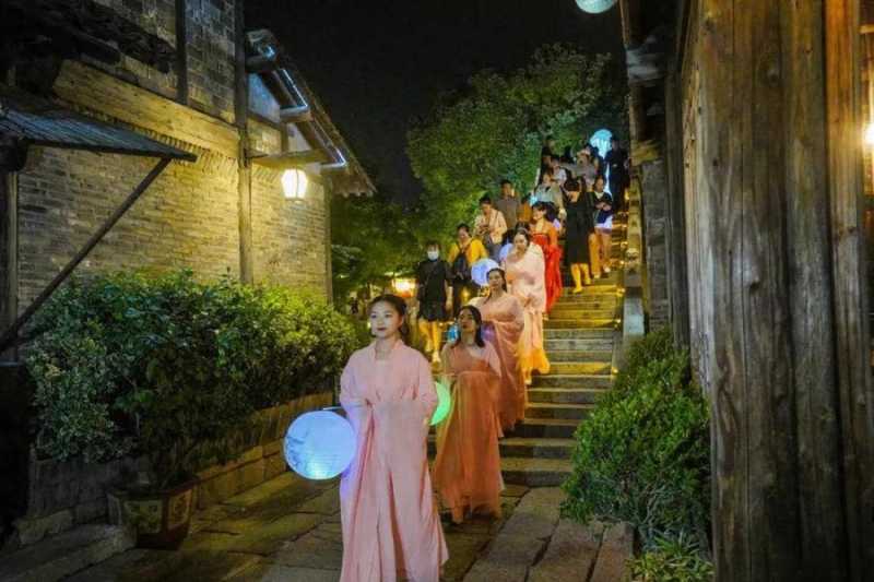 南京、上海等地的一大特色活动叫“走月”。明代南京建有望月楼、玩月桥,清代狮子山下有朝月楼,都是游人“走月”时的赏月胜地。在上海等地,人们在中秋之夜出游时,要走过三座桥才能停下来,因此“走月亮”也叫“走三桥”。而东北人的“走月”是夜赶庙会。清人蔡云在《吴歈·走月亮》一诗中咏道:“木犀球压鬓丝香,两两三三姊妹行。行冷不嫌罗袖薄,路遥翻恨绣裙长。”