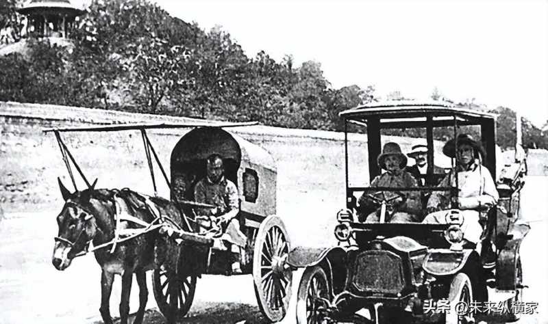 这张照片拍摄于晚清时期,一辆马车和一辆汽车并排在路上行驶。可以看出,路面的状况并不理想,但是汽车仍然能够轻松地超过马车,显示了它的速度和性能。这是一幅生动的历史画面,反映了清朝社会的落后和变革,也是一件珍贵的文物。