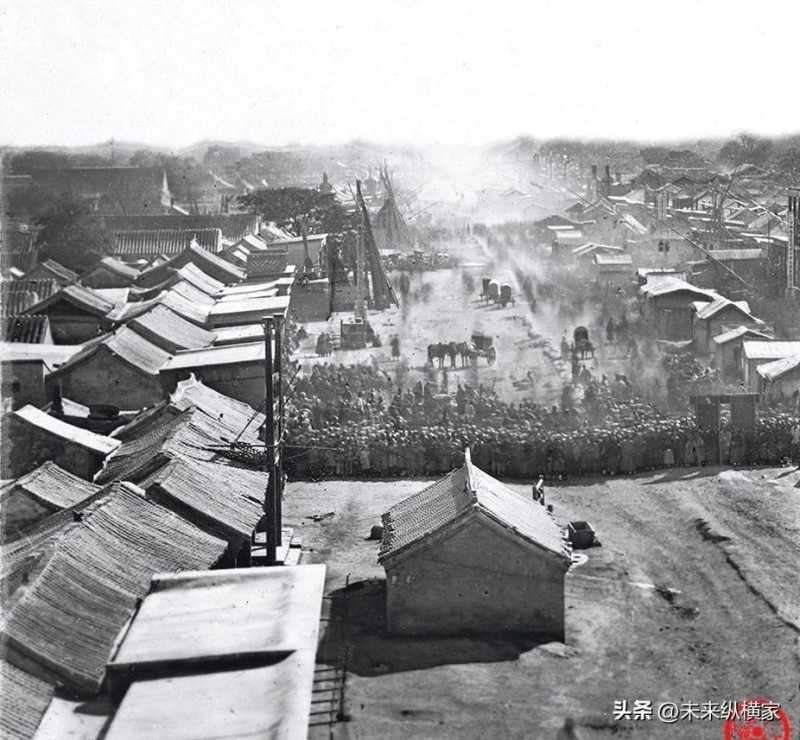 这张照片是1860年英法联军攻陷北京时拍摄的,摄影师站在安定门城楼上,向北方望去,可以看到城墙外的一片繁华。街上有很多人,有的在走路,有的在围观,有的在买卖。街道两旁是一些低矮的房屋,有的是正规的建筑,有的是私自搭建的棚屋,占用了很多空间,显得杂乱无章。从这张照片中,可以看出当时北京的市容市貌是多么的差劲。