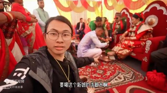 我现在正在尼泊尔的一个印度族的家庭里面参加他们的婚礼,所有来访的客人需要喝新郎官的洗脚水,就是要把洗脚水喂到嘴里喝。大家看一下,这样就能代表新娘在他们家里面能够过得幸福快乐。